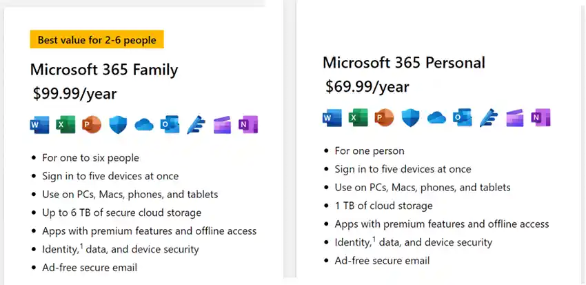 در تصویر مشخصه که برای تک کابر ( یک اکانت ماکروسافت ) قیمت سالانه 69.99 دلار و برای 2 تا 6 کاربر سالانه 99.99 دلار می باشد .